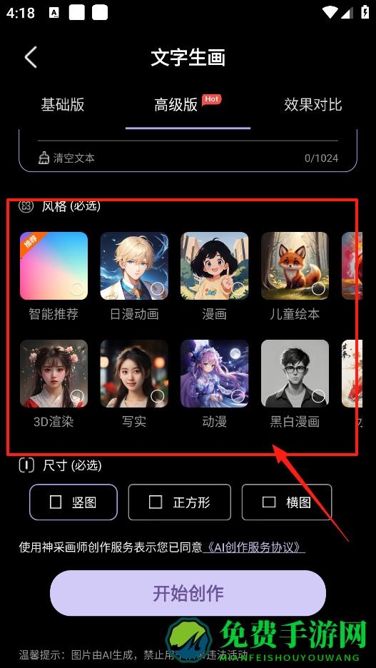 3、进入文字生画的高级版界面,有好多风格可以选,像日漫动画,漫画,写实这些,选好风格后,再选图片尺寸,然后点开始创作,就能生成符合你要求的画啦。