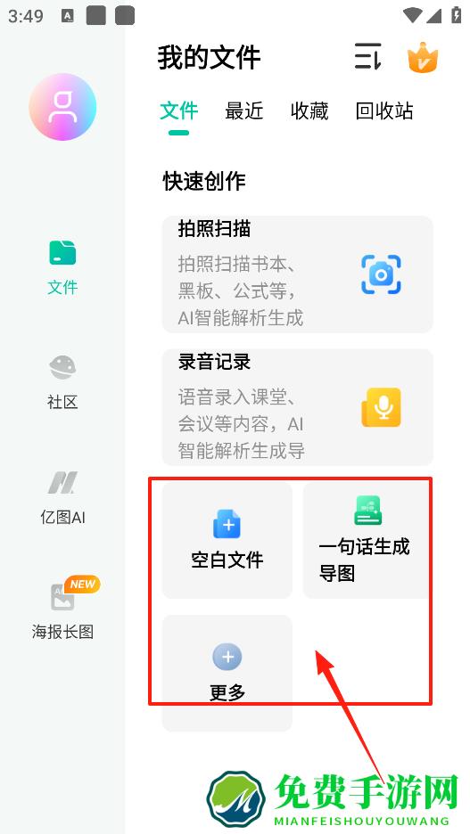 1、在我的文件页面有一句话生成导图功能,你只要输入一句话,软件就能快速生成思维导图,特别方便,不用自己慢慢去梳理结构,能满足不同的创作需求。