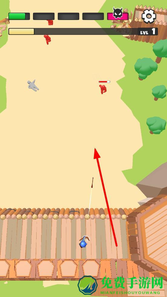 1、进入关卡,立足木墙后瞄准红灰敌人,滑动屏幕移动角色位置,优先射击血薄速快的敌人,避免其靠近城墙。