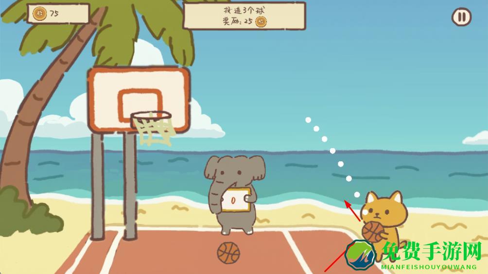 1、在海滩篮球场场景中,操控小动物投篮,瞄准篮筐投掷篮球,尝试达成投进3个球等目标,获取25金币等奖励。