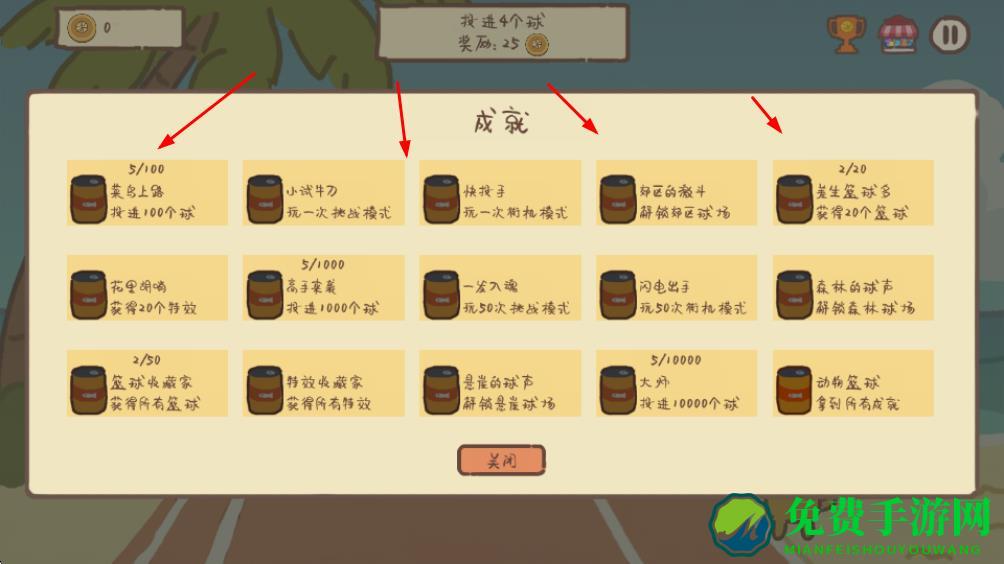 3、参与投篮挑战,完成投进100个球玩一次挑战模式等成就任务,解锁菜鸟上路小试牛刀等成就,提升游戏进度。