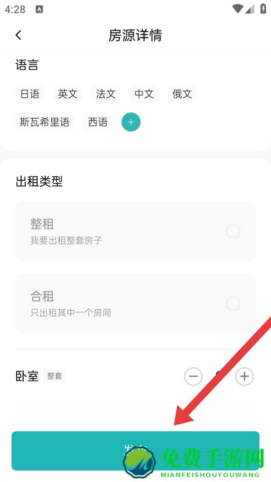 3、进入房源详情的页面,填写好语言、出租类型等信息后,点击底部的发布按钮,即可完成房源发布。