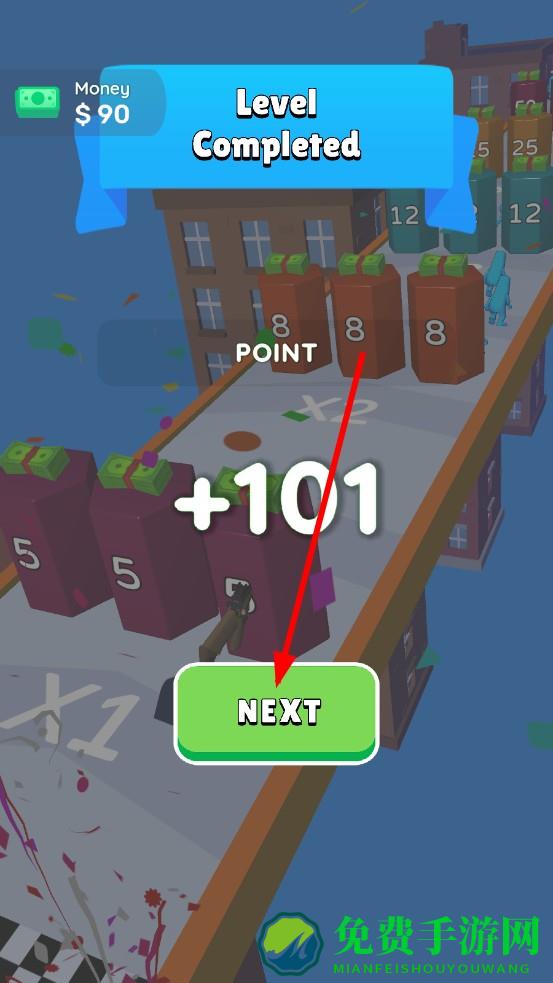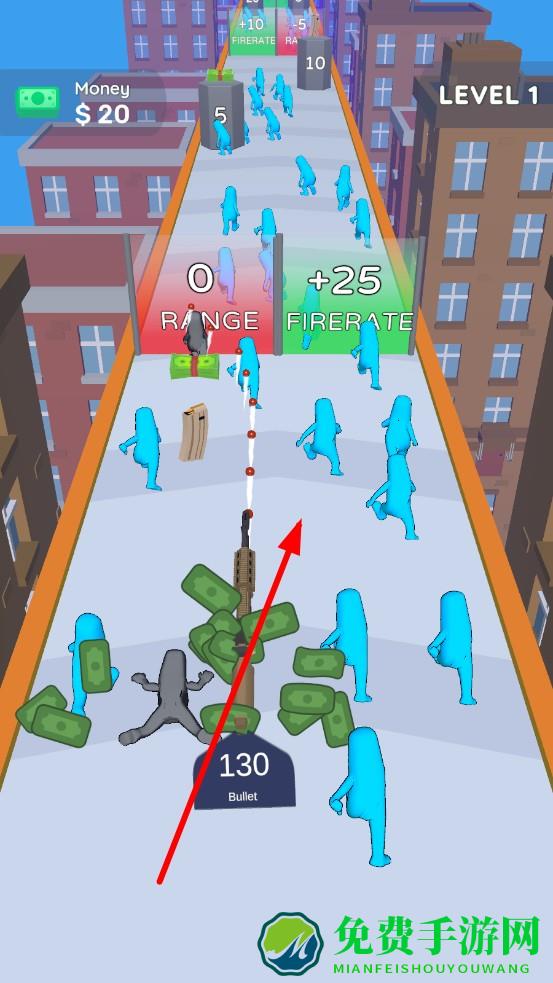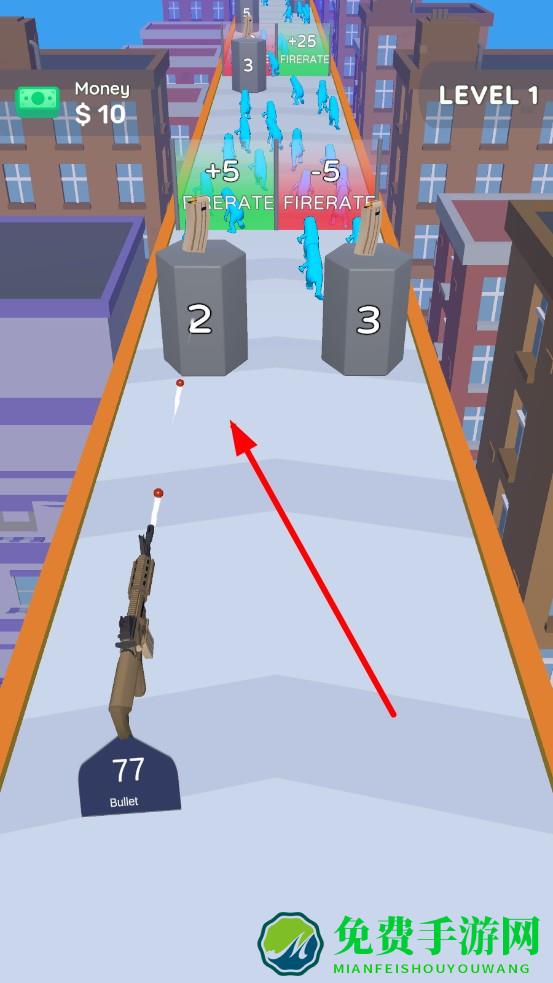 2、渐进式关卡设计:关卡从窄通道向宽街道延伸,敌人从零散到密集,还加入移动障碍,每一关都带来新射击挑战,刺激玩家突破极限。