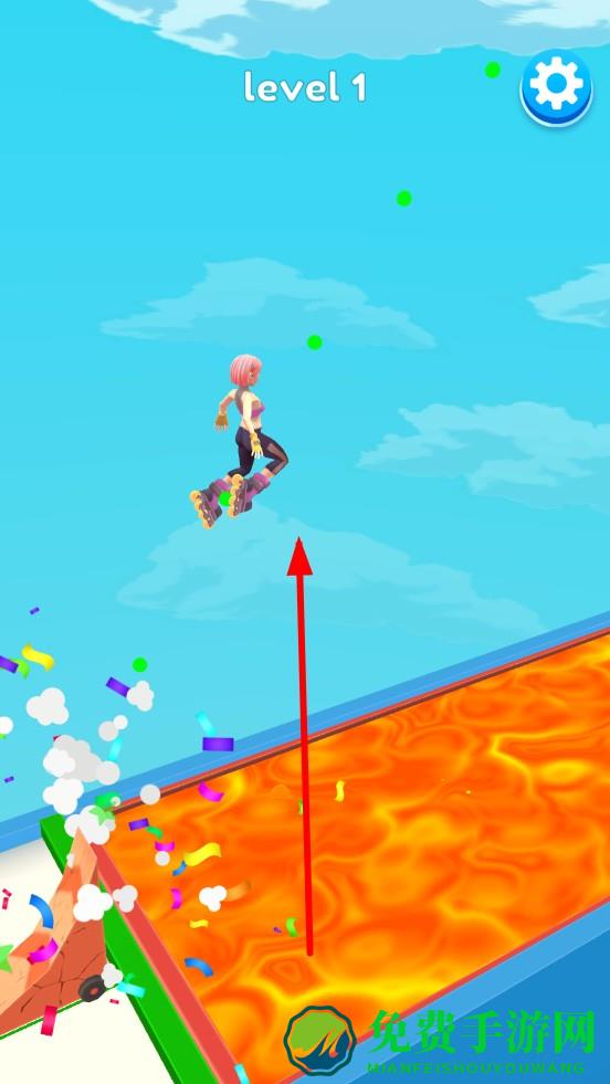 2、滑动屏幕改变斜坡的角度,观察虚线,让角色成功跳过挡板和底下的岩浆,力求精准跨越熔岩、冲破砖墙。