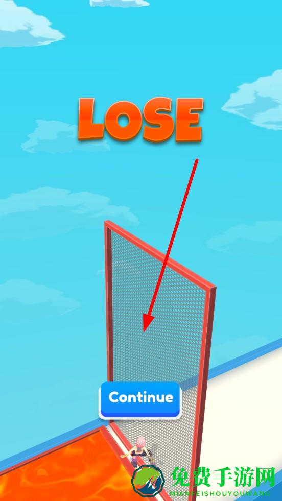 3、若角色坠落熔岩池或未抵达终点网门,界面弹出LOSE与蓝色Continue按钮,点击重置关卡,重新调整斜坡参数与启动时机,挑战完美通关。