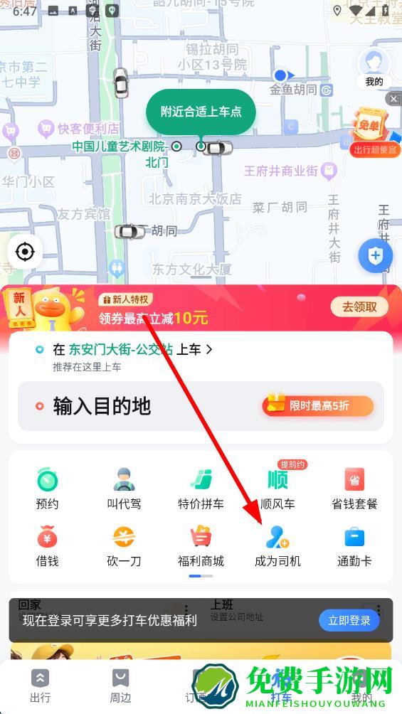 2、在打车界面里,找到并点击成为司机的按钮,进入司机注册相关页面。