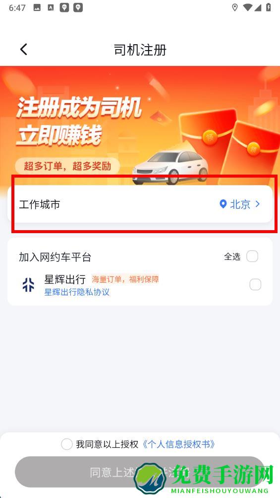 3、在司机注册页面中,首先点击工作城市选项,选择你计划接单的城市。
