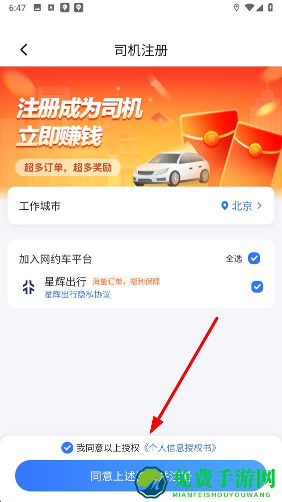 4、选择想要加入的网约车平台,勾选平台对应的隐私协议,最后点击同意上述协议并注册,按后续提示完成注册流程即可接单。