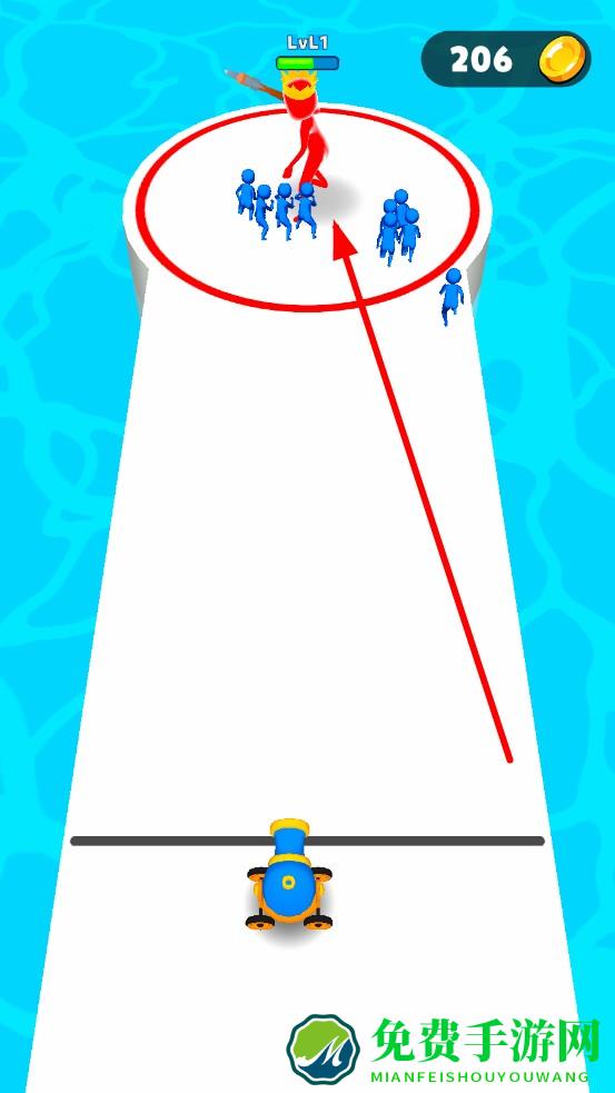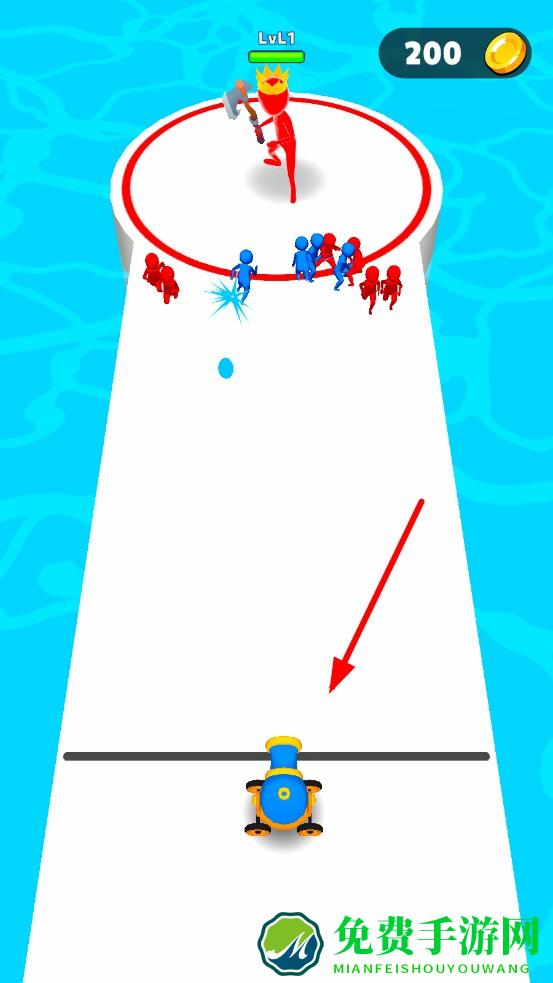 1、兵力转化对抗:蓝色小人从零散发射到军团成型,数量积累直接左右胜负;每发炮弹都是兵力转化关键步,见证弱势小兵群演变为碾压军团,从单点突破到全面包围冲击。