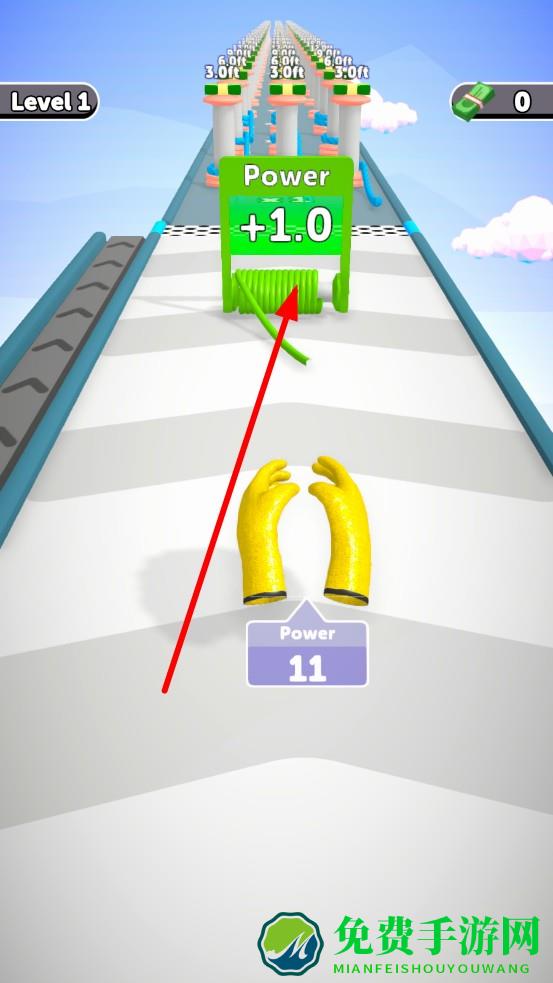 1、进入关卡轻划屏幕操控手套起跑,观察长绳索卷轴,规划路线,靠近时手套自动吸附,积累初始长度,为后续的升级做准备。