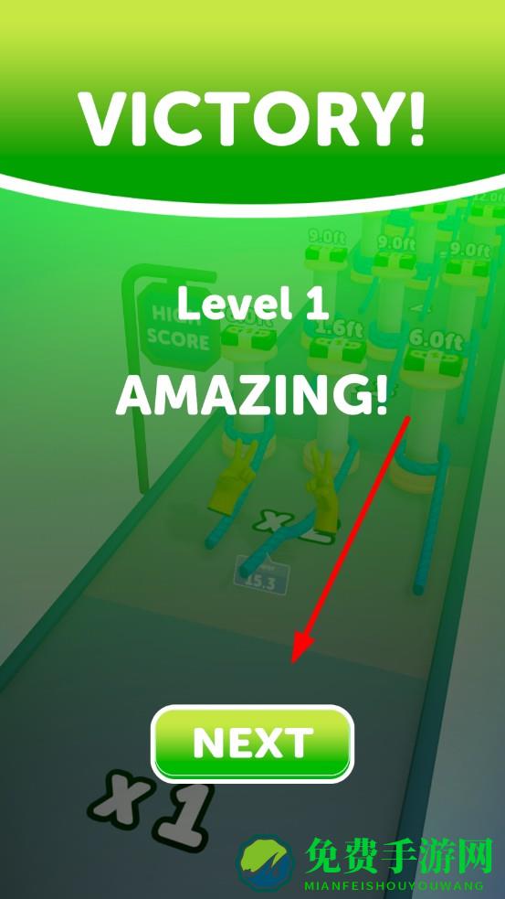 3、抵达终点绳索长度达标触发胜利判定,屏幕弹出VICTORY,点击NEXT踏入下一关,解锁更加复杂的全新赛道。