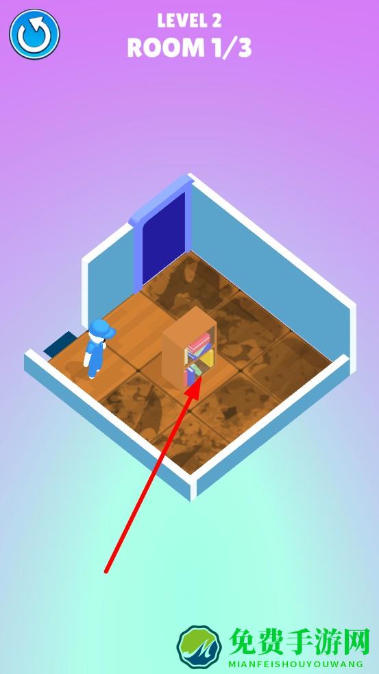 1、进入LEVEL2中的首间房,观察布局预判清洁顺序,滑动拖把,清扫地面灰尘与水渍,完成区域清洁解锁通往下一房间的门。