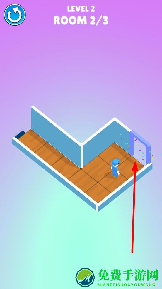 2、穿梭至第二房间,清理沿途污渍与角落积灰,抵达终点门确保清洁度达标,确认房间彻底清理,解锁最终房间通道。