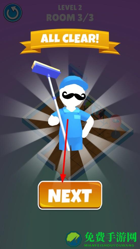 3、三间房清洁完毕,屏幕弹出ALL CLEAR,点击NEXT,开启下一关,进入布局更复杂、任务更丰富的新关卡。