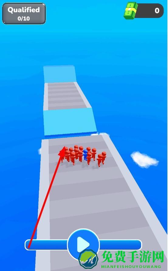 1、进入关卡,观察红色人群站位与赛道初始布局,将蓝色小人成功护送到终点,即可通关。