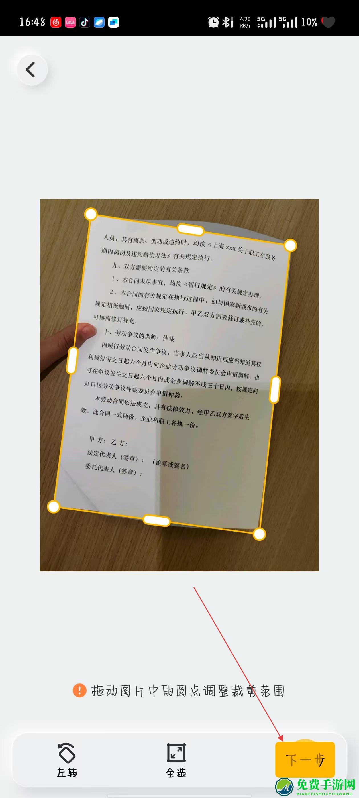 3、点击拍摄按钮完成拍摄后,在裁剪界面拖动边缘的调整点,把文档区域精准框选出来,然后点击下一步。