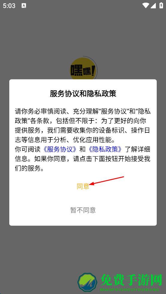 1、打开嘿嘿漫画APP,在服务协议和隐私政策界面,仔细阅读相关条款后,点击同意,进入APP主界面。