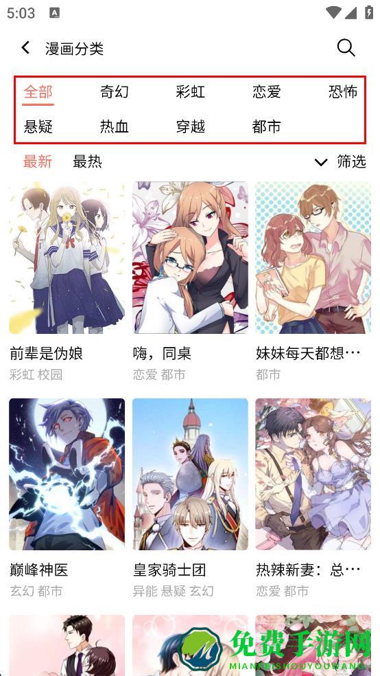 2、在APP主界面,点击全部分类,进入漫画分类页面,可看到奇幻、彩虹、恋爱等多种漫画分类选项。