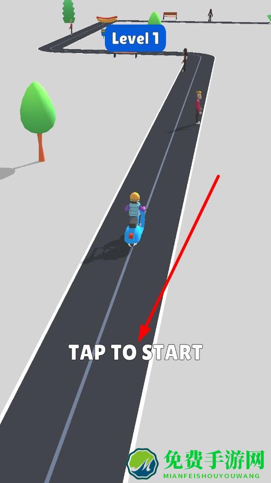 1、轻触屏幕TAP TO START,角色跨上自行车,沿道路箭头方向前行,需留意沿途出现的路人障碍。