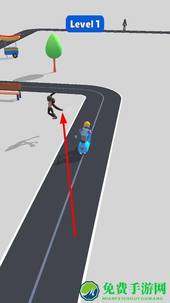 2、当路边行人进入攻击范围,点击触发踢腿动作,角色重心随踢击微晃,路人踉跄飞出,预判踢腿位置,保持骑行节奏。