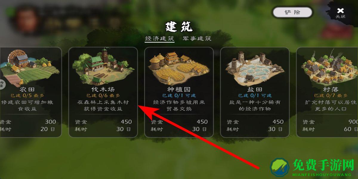 2、然后建造资源点,在建筑界面,可建造农田、伐木场等经济建筑,农田能增加粮食收益,伐木场可在森林上采集木材获得资金收益,为势力发展积累资源。