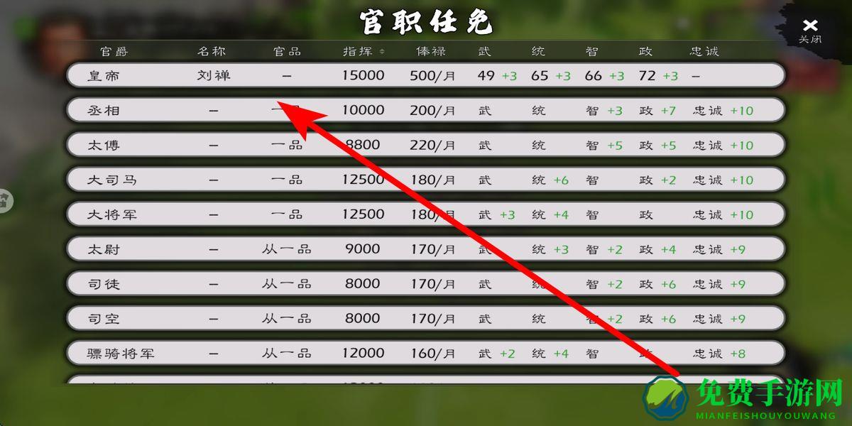 3、接着进行内政人才管理,在官职任免界面,可对不同官爵进行人员任命,不同官职有着不同的俸禄与属性加成,合理任免人才,能提升势力的内政等方面能力。