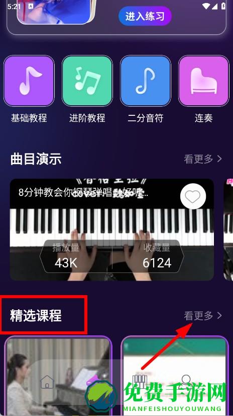 1、打开音基考级APP,在首页点击底部带钢琴图标的箭头,进入课程页面。