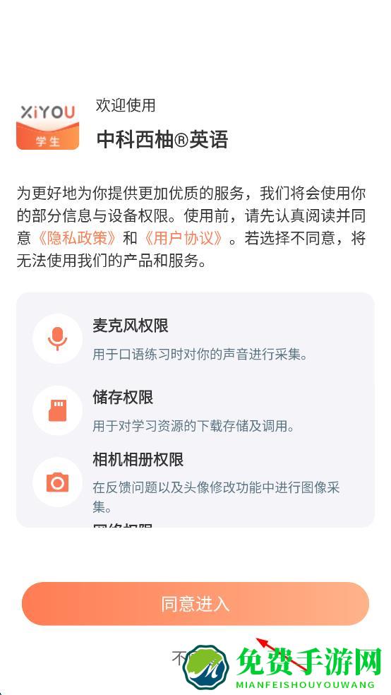 1、打开中科西柚英语APP,弹出权限及协议提示页面,仔细阅读隐私政策和用户协议后,点击“同意进入”按钮,进入登录或注册页面。