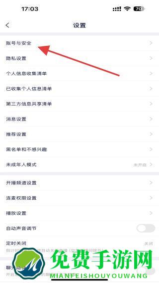 1、打开yy直播APP,在设置页面内找到并点击账号与安全的功能按钮。