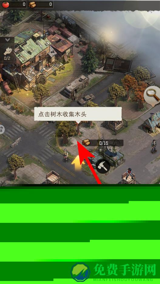 1、首先收集资源,场景中找到树木等资源点,点击树木,按照提示进行操作,收集木头等资源,这些资源是后续建设的基础材料。