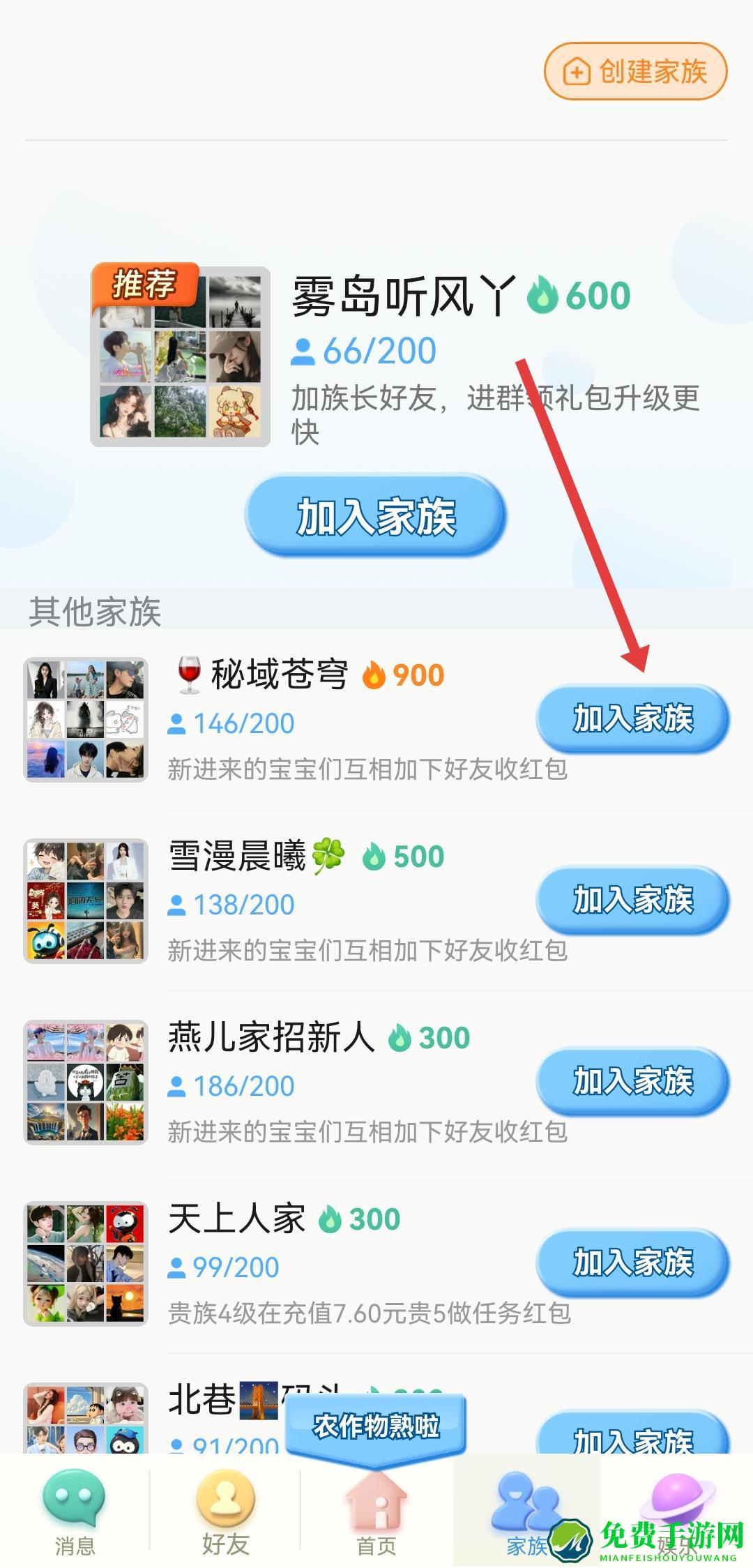 2、在家族页面,找到要加入的家族如秘域苍穹,点击其右侧的加入家族按钮。
