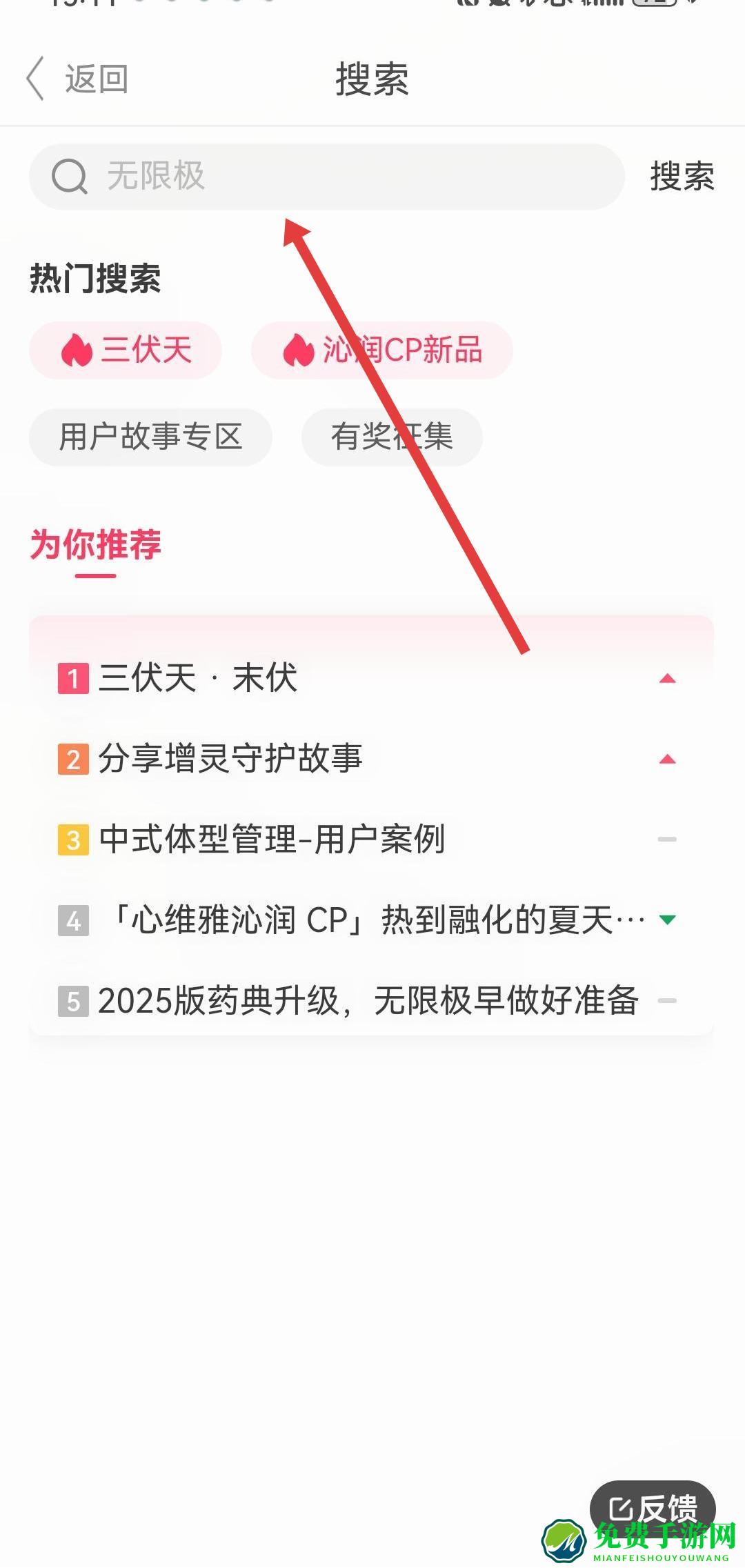 1、进入无限极最新版APP的首页,点击顶部搜索栏,跳转至搜索界面,可以查找资讯、产品等内容。