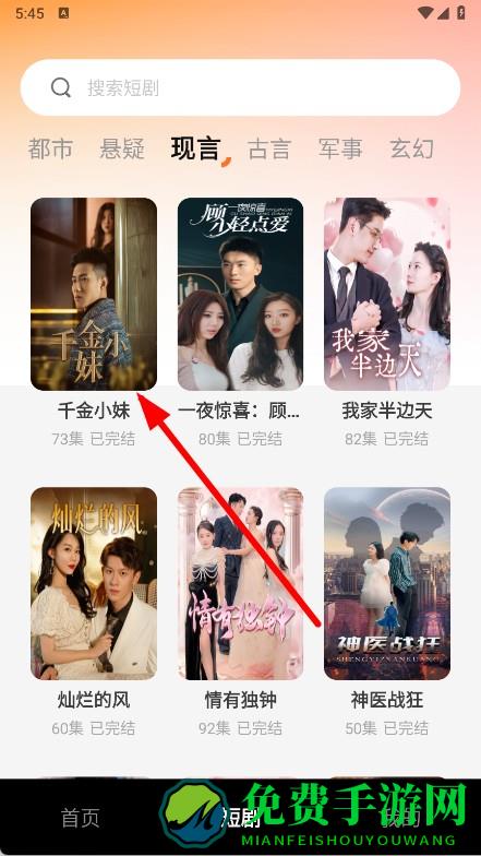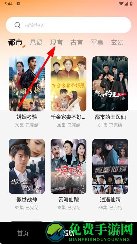 2、在短剧分类页面,点击现言分类标签,切换到现代言情类短剧列表。