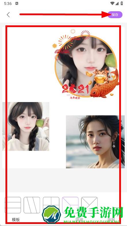 4、选择模板,自由,海报等拼接方式,完成拼图设置后,点击右上角的保存按钮。