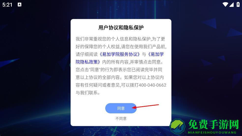 1、打开易加学院软件,弹出“用户协议和隐私保护”提示框,仔细阅读相关内容后,点击“同意”按钮,进入下一个提示界面。