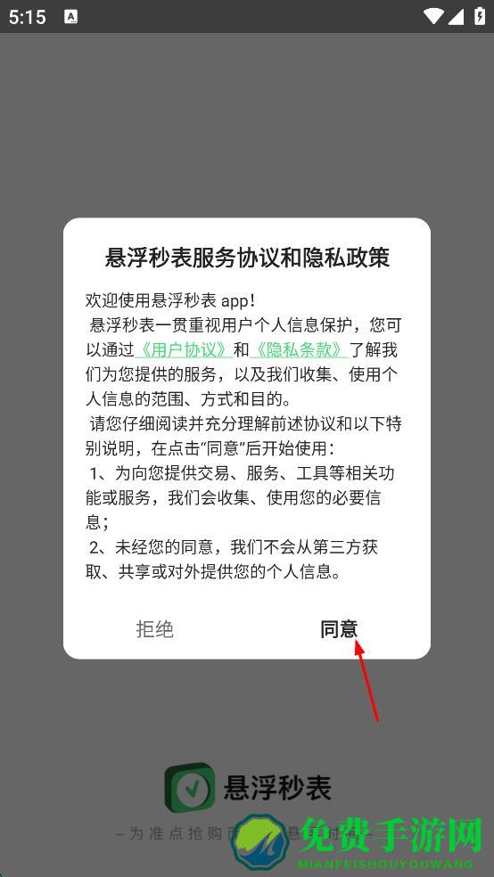 1、打开悬浮秒表软件,弹出“悬浮秒表服务协议和隐私政策”提示框,认真阅读相关内容后,点击“同意”按钮,进入软件的选择平台时间界面。