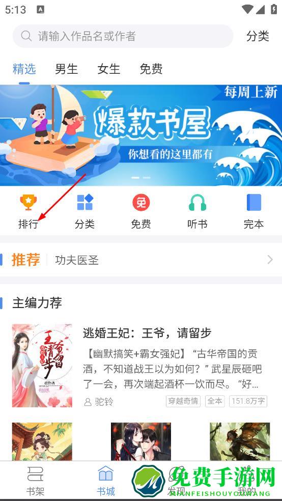 1、进入首页,在书城页面,点击排行,进入排行榜页面。