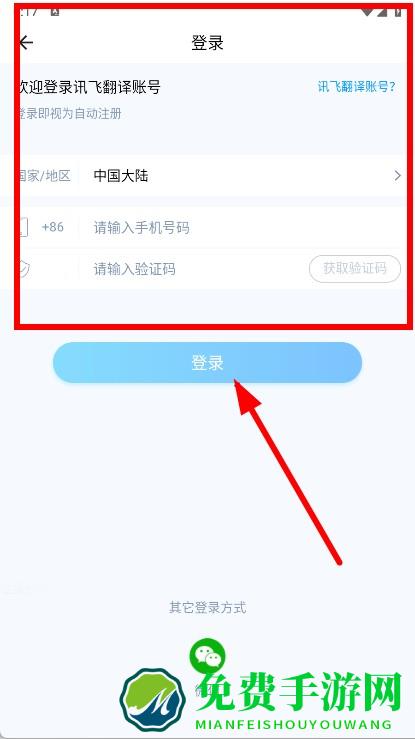 4、选择国家地区,输入手机号码,点击登录按钮,完成登录操作。