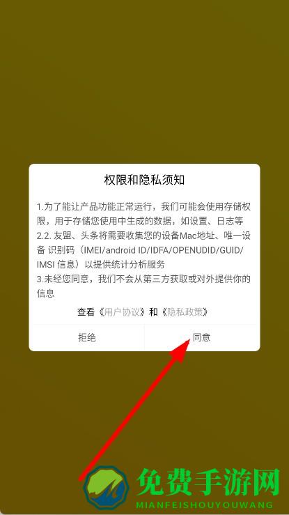 1、打开APP,在弹出的权限和隐私须知提示框中,点击同意按钮。