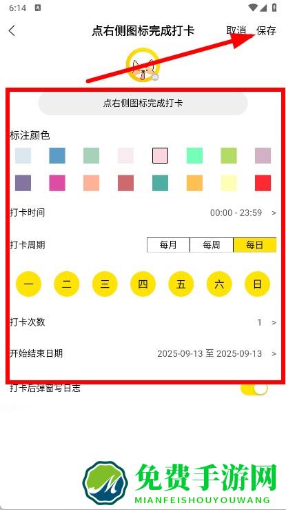 4、设置标注颜色、打卡时间、打卡周期等信息后,点击保存按钮完成打卡计划的编辑。