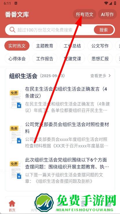 1、打开APP,点击页面上方的所有范文选项,进入范文目录页面。