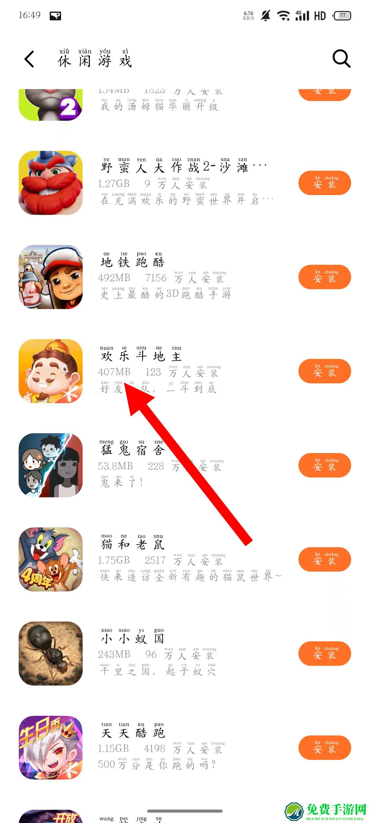 3、在休闲游戏列表页面,选择想要安装的游戏,点击进入该游戏的详情页面。