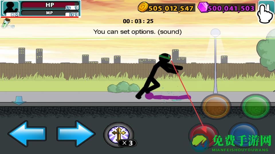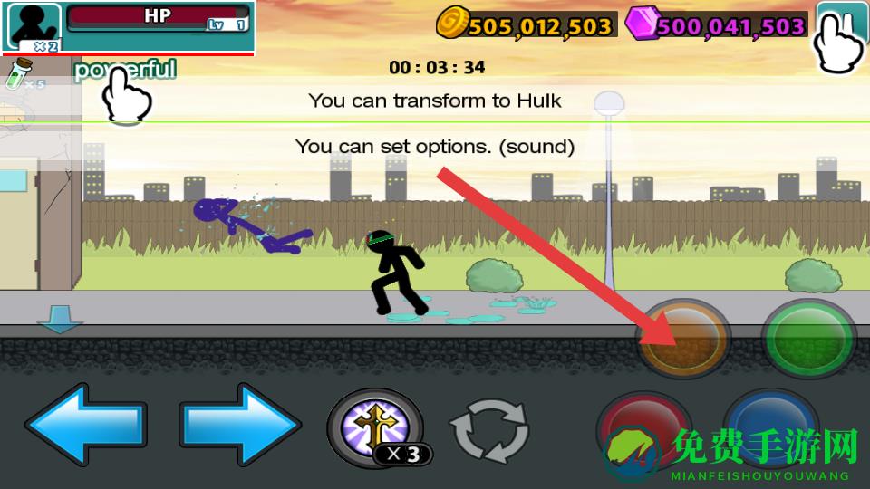 1、进入城市街道场景后,先熟悉基础操作:左侧方向键控制火柴人左右移动,右侧拳腿按键分别对应近战攻击。