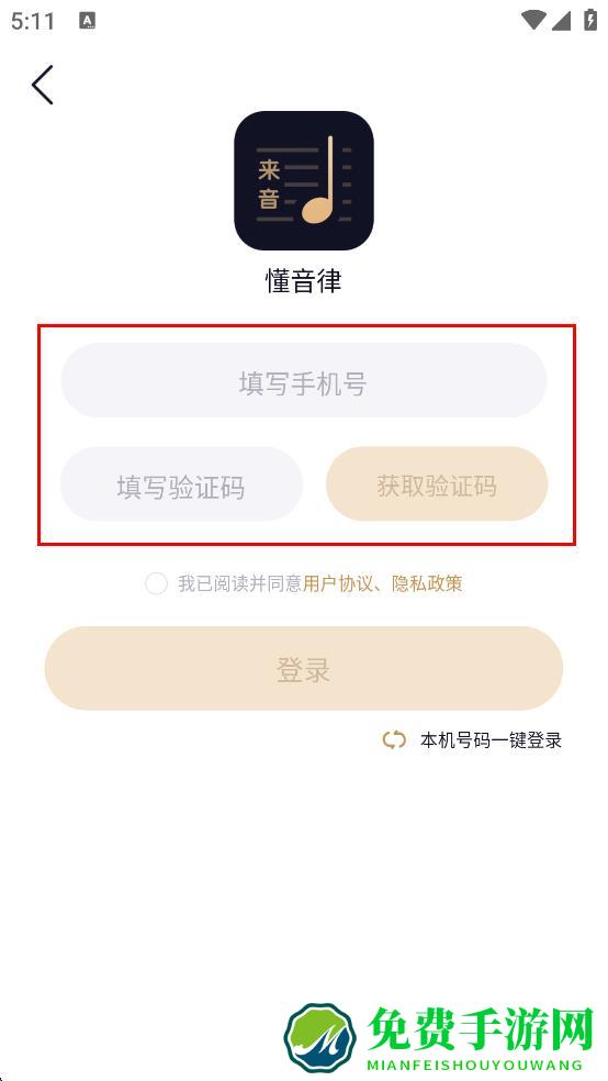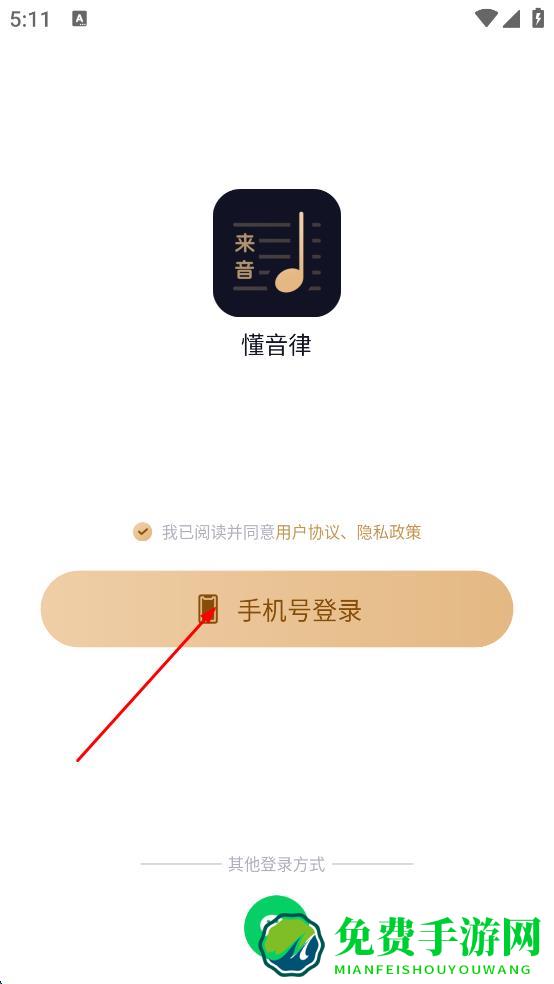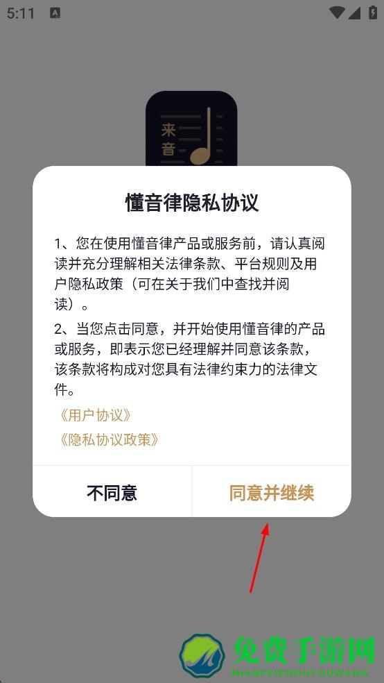 1、打开懂音律APP,弹出懂音律隐私协议提示框,仔细阅读相关内容后,点击“同意并继续”按钮,进入登录选择页面。