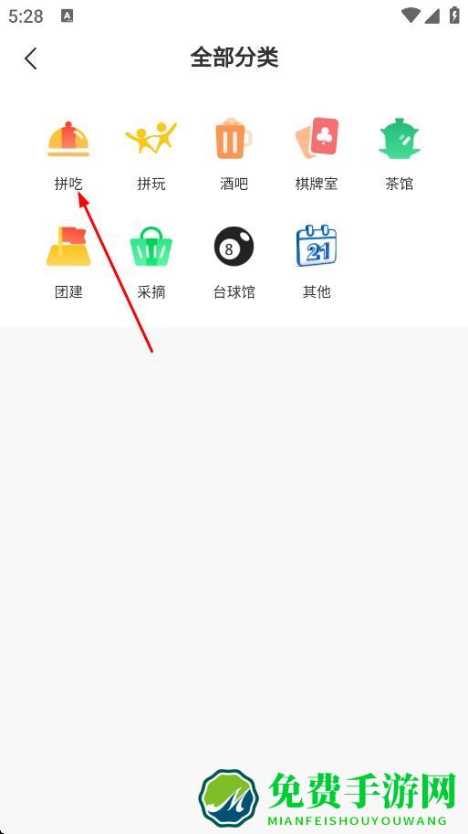 2、在全部分类页面,点击拼吃,进入拼吃活动列表页面。
