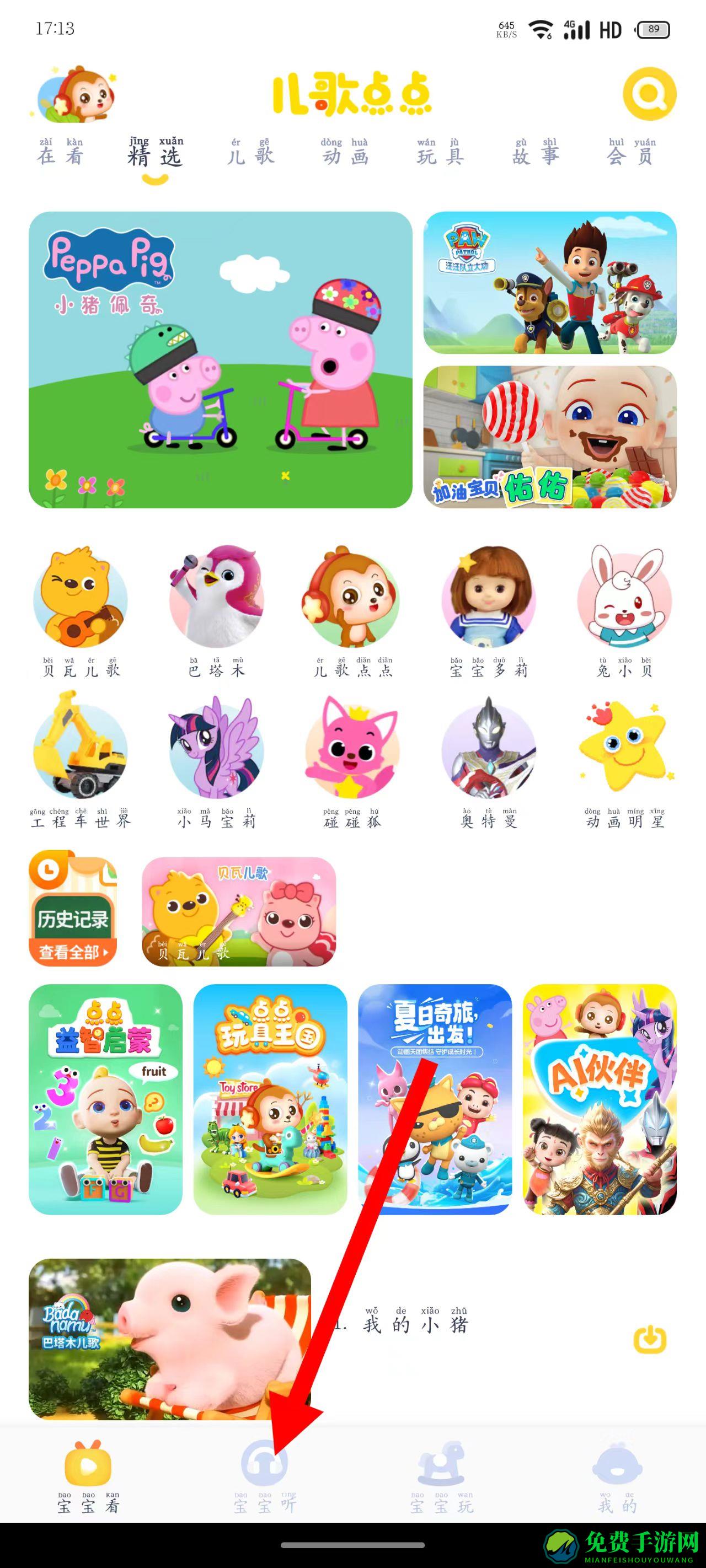 1、打开APP,进入主界面后,点击底部的宝宝听选项,进入音频内容页面。