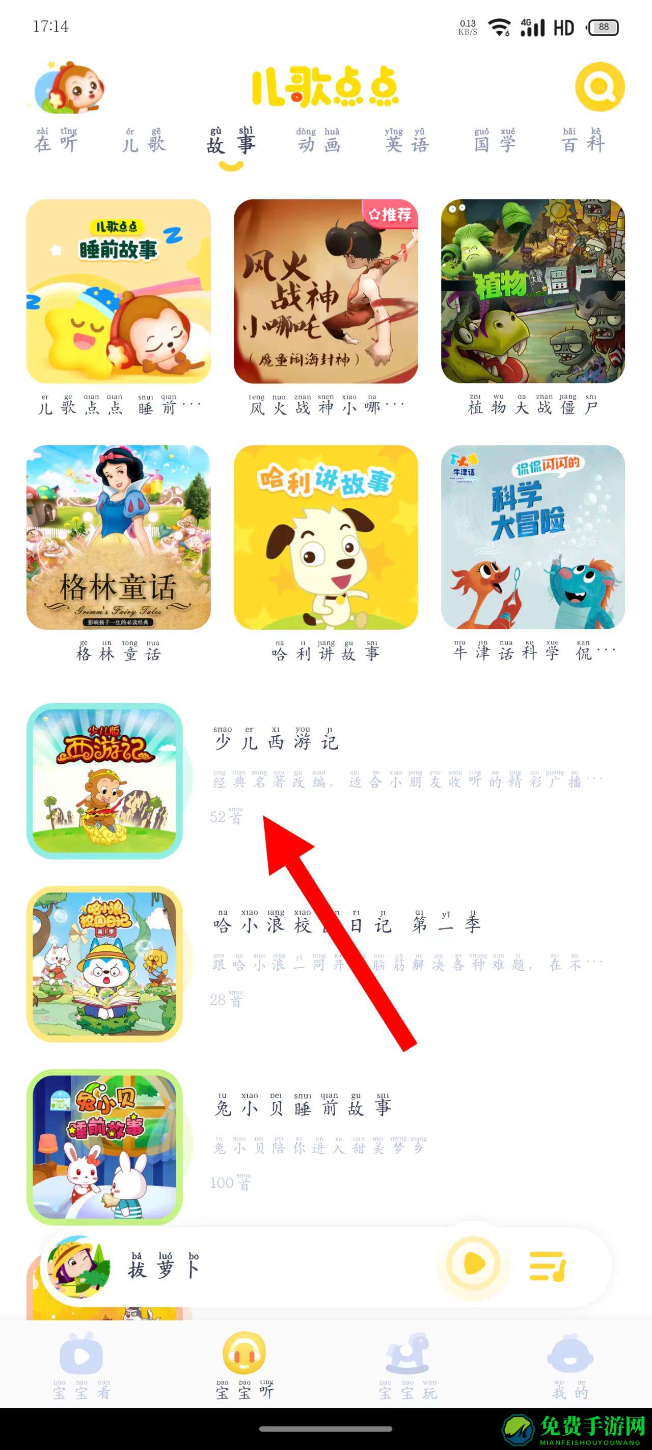 2、在音频内容页面,找到故事分类,点击进入故事列表页面,找到并点击。
