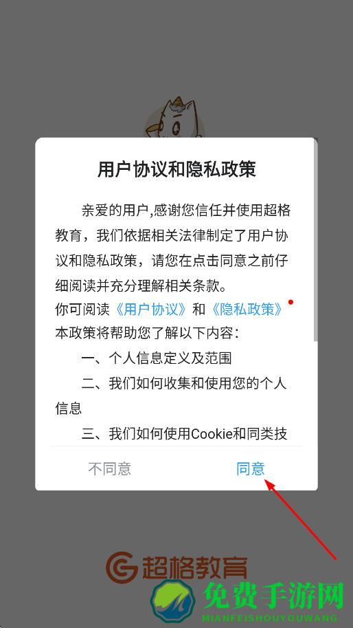 1、在用户协议和隐私政策弹窗中,点击同意,即可使用超格教育相关功能。