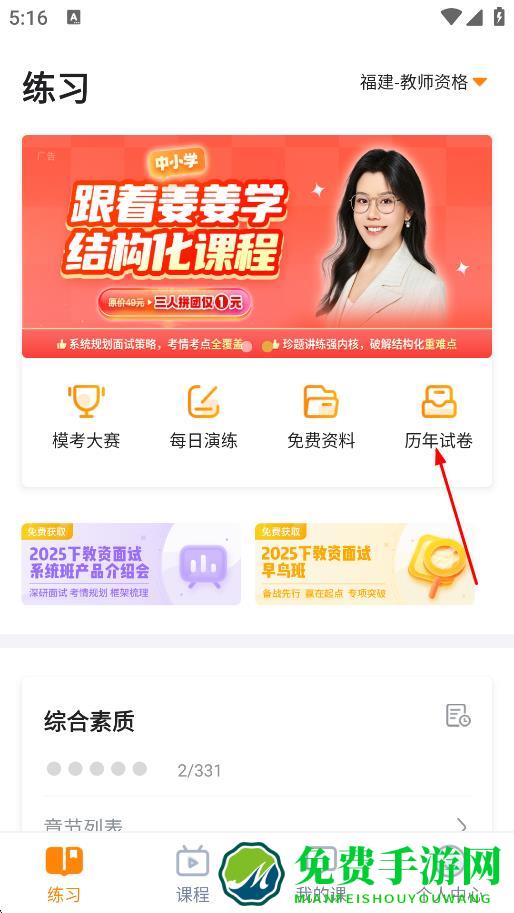 2、在练习页面,点击历年试卷,进入历年试卷页面。