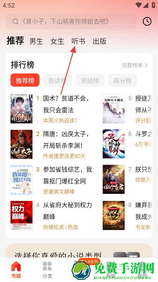 1、进入软件书城页面,点击顶部听书选项,切换到听书板块。